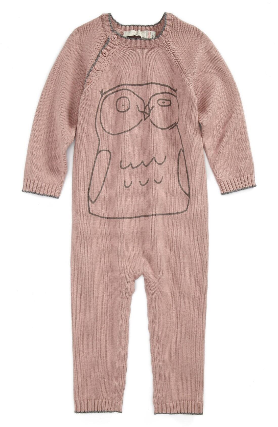 Tea-rose farvet med kontrasterende grøn syning, et billede af en ugle foran. Denne tynde og bløde buksedragt er lavet af bomuld i højeste kvalitet.